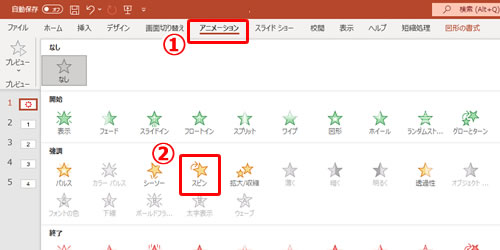 グループ化した図形を選択した状態で、(1)アニメーションタブを選択し、(2)強調の項目のスピンを選択します。