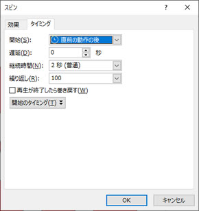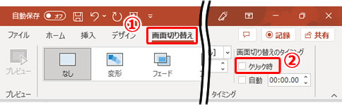 (1)画面の切り替えタブを選択します。エフェクトは任意に行ってください。(2)画面の切り替え時のタイミングのクリック時のチェックを外します。