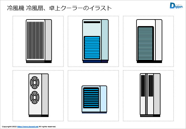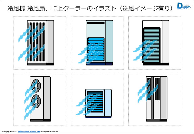 冷風機 冷風扇、卓上クーラーのイラスト、冷風が出ているイメージ、各種形状など12種類