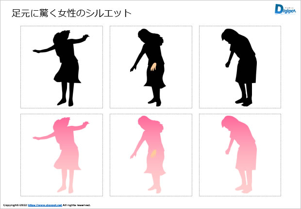 足元に驚く女性のシルエット、飛び上がる、足元への目線、白黒、グラデーション、フチ有フチ無しなど6種類