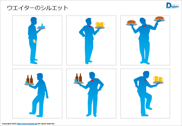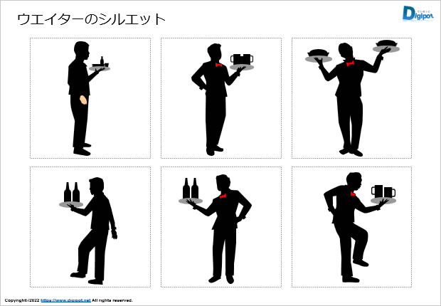 フリー、無料で使えるウエイターのシルエット画像です。パワーポイントPPTX形式と、パワーポイントから書き出したPNG透明形式ファイル版を用意しています。