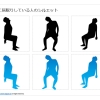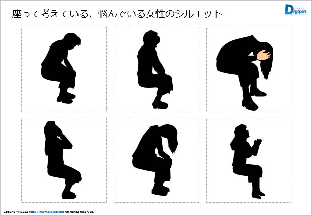 座って考えている、悩んでいる女性のシルエット、思考中、気落ち、後悔、白黒、グラデーション、フチ有フチ無しなど12種類