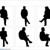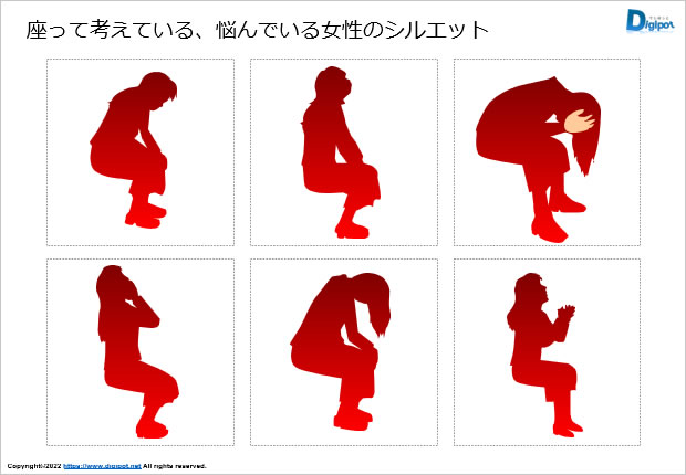 フリー、無料で使える座って考えている、悩んでいる女性のシルエット画像です。パワーポイントPPTX形式と、パワーポイントから書き出したPNG透明形式ファイル版を用意しています。