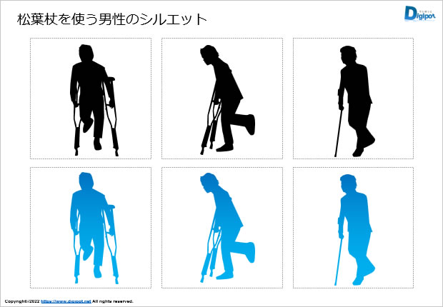 松葉杖を使う男性のシルエット、松葉づえで歩く、骨折、ケガ、白黒、グラデーションなど6種類