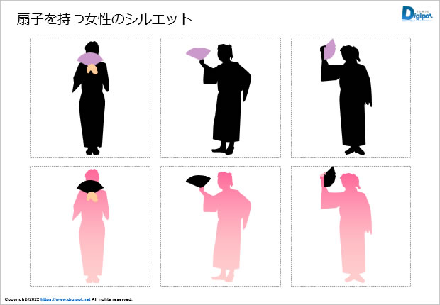 扇子を持つ女性のシルエット、浴衣、扇子で仰ぐ、白黒、グラデーションなど6種類