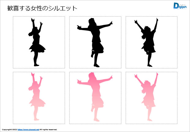 歓喜する女性のシルエット、踊る、小躍り、白黒、グラデーションなど6種類