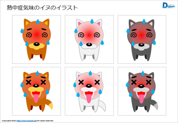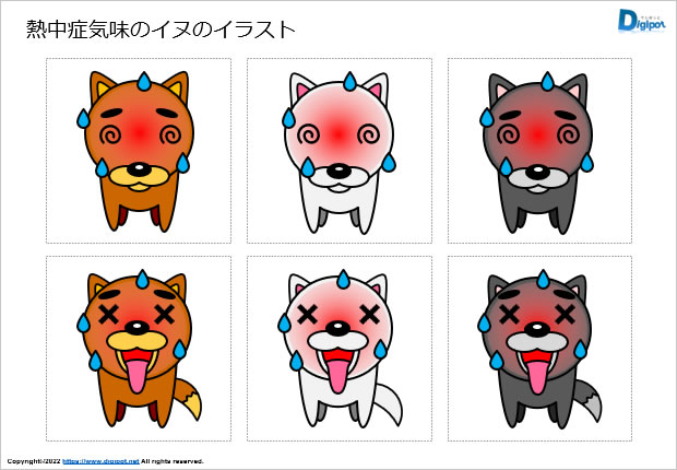 熱中症気味のイヌのイラスト、ペット、暑さでへばる、暑さで苦しむ、各種毛並み、フチ有フチ無しなど12種類