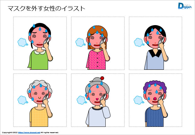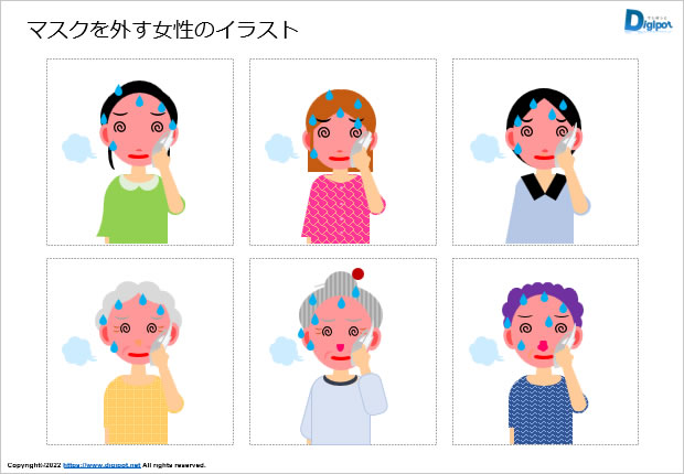 マスクを外す女性のイラスト、おばあちゃん、熱中症気味、大汗、フチ有フチ無しなど12種類