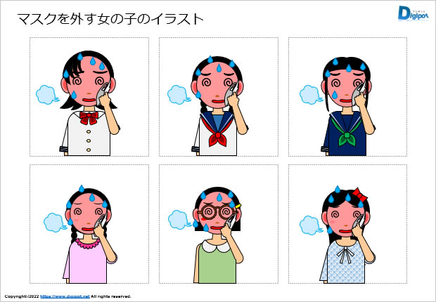 マスクを外す女の子のイラスト、小学生、中学生、高校生、熱中症気味、大汗、フチ有フチ無しなど12種類