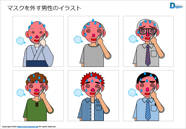 マスクを外す男性のイラスト、おじいちゃん、熱中症気味、大汗、フチ有フチ無しなど12種類