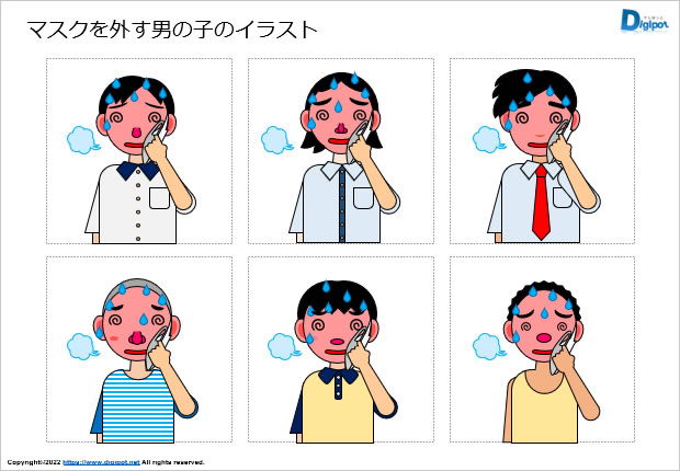 マスクを外す男の子のイラスト、小学生、中学生、高校生、熱中症気味、大汗、フチ有フチ無しなど12種類