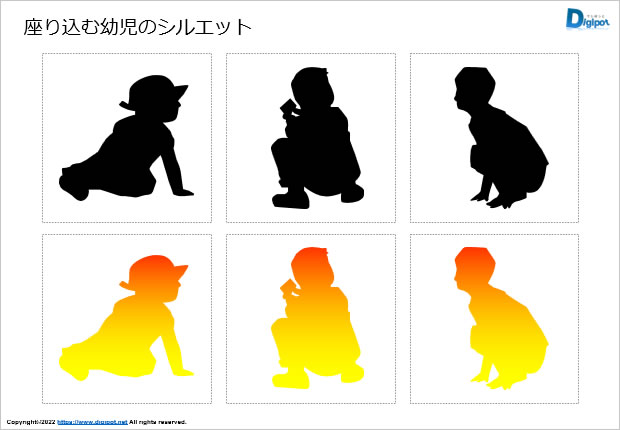 座り込む幼児のシルエット、座る、白黒、グラデーションなど6種類