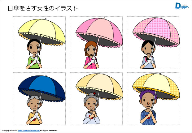日傘をさす女性のイラスト、日よけ、熱中症対策、フチ有フチ無しなど12種類