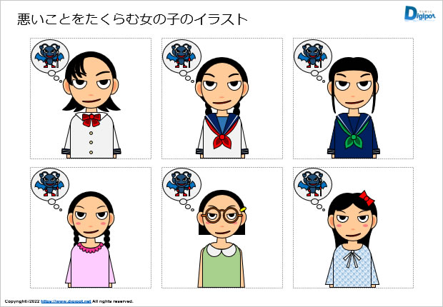 悪いことをたくらむ女の子のイラスト、小学生、中学生、高校生、悪だくみ、良からぬ考え、フチ有フチ無しなど12種類