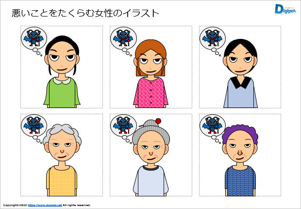 悪いことをたくらむ女性のイラスト、おばあちゃん、主婦、悪だくみ、良からぬ考え、フチ有フチ無しなど12種類
