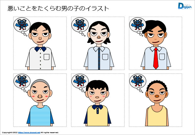 悪いことをたくらむ男の子のイラスト、小学生、中学生、高校生、悪だくみ、良からぬ考え、フチ有フチ無しなど12種類