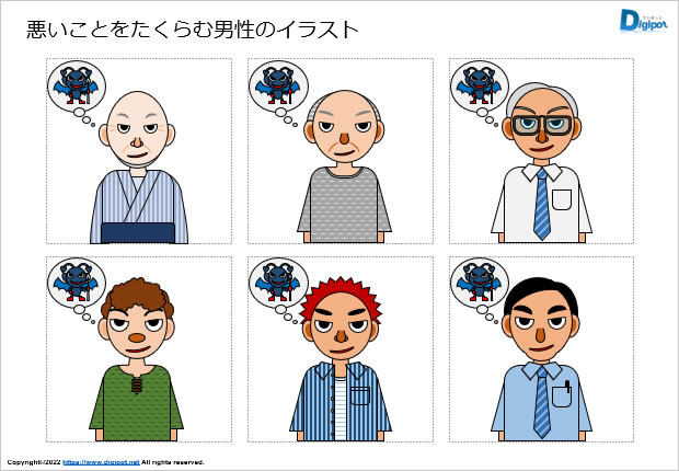 悪いことをたくらむ男性のイラスト、おじいちゃん、サラリーマン、悪だくみ、良からぬ考え、フチ有フチ無しなど12種類