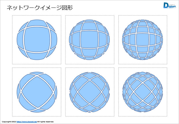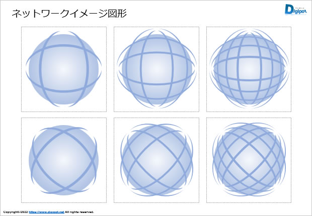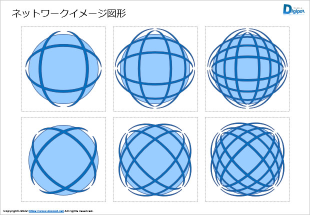 インターネットのネットワークをイメージするような図形です。円と月形の図形を組み合わせて作成しています。