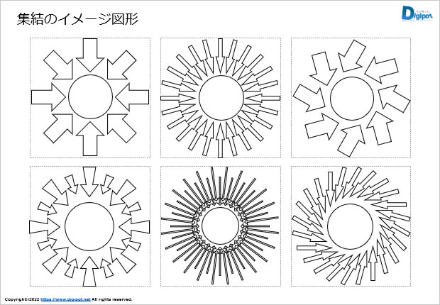 集結のイメージ図形、中央に向かう矢印群、線画、色付きなど12種類