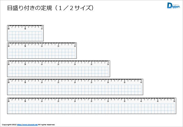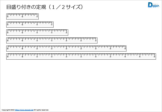 目盛り付きの定規のイラスト、10cm、20cm、30cm、40cm、50cm、原寸と1/2サイズ、利用サンプルなど