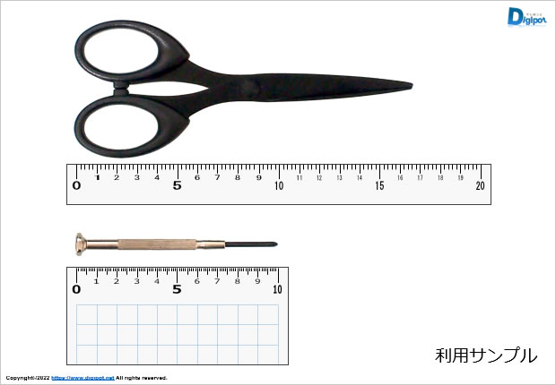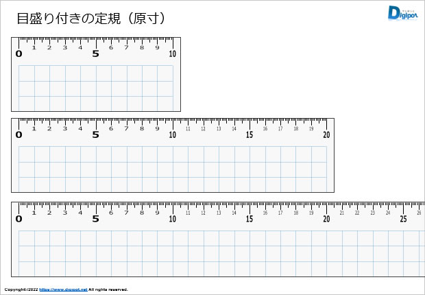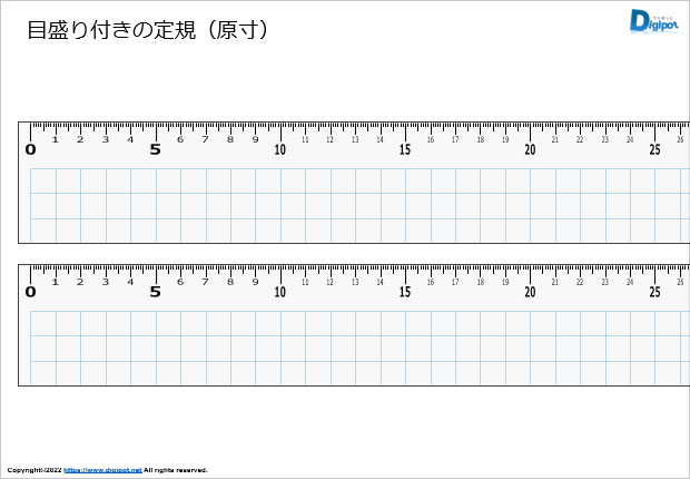 フリー、無料で使える目盛り付きの定規画像です。パワーポイントPPTX形式と、パワーポイントからコピペしたエクセルXLSX形式ファイル版を用意しています。