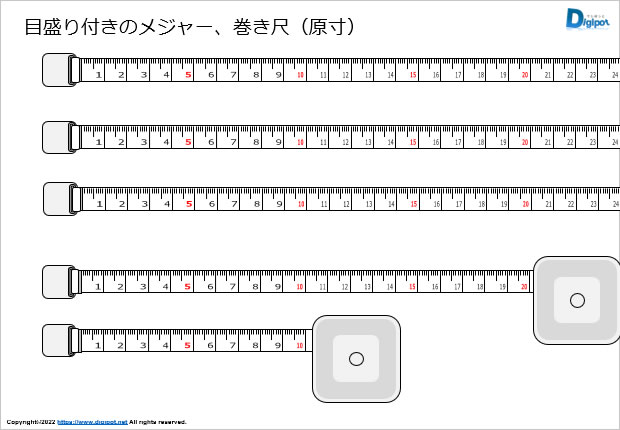 目盛り付きのメジャー、巻き尺のイラスト、10cm、20cm、30cm、40cm、50cm、原寸と1/2サイズ、利用サンプルなど