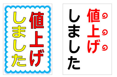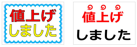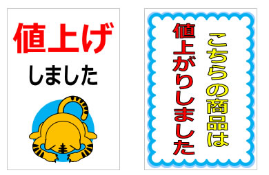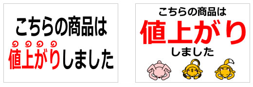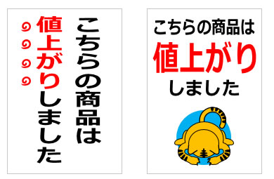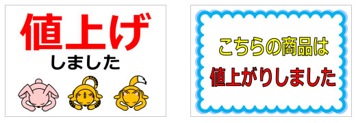 値上げを知らせる各種貼り紙集です。商品が値上げされたことを周知します。