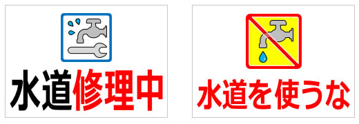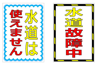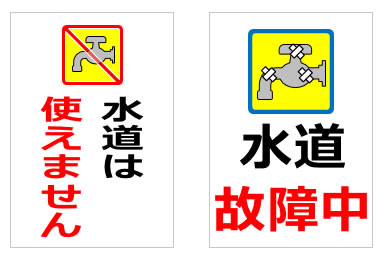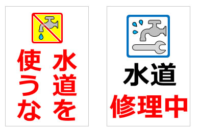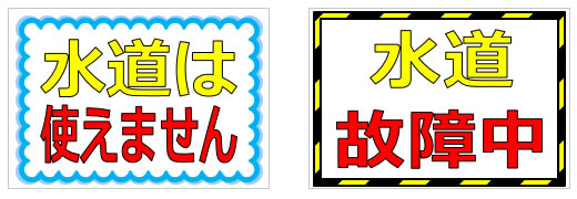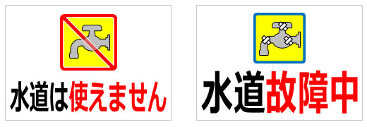 水道に関する各種貼り紙集です。故障や修理、水道が使えないことなどを知らせます。