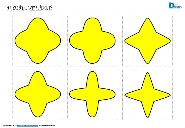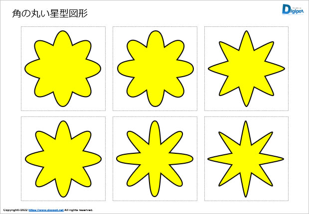 シンプルなとんがり部分を丸くした星形図形です。4/5/6/8のとんがりのある星を各種パターン用意しています。とがった星より丸みがあるとやわらかい印象になりますね。各種資料作りの素材などにご活用ください。
