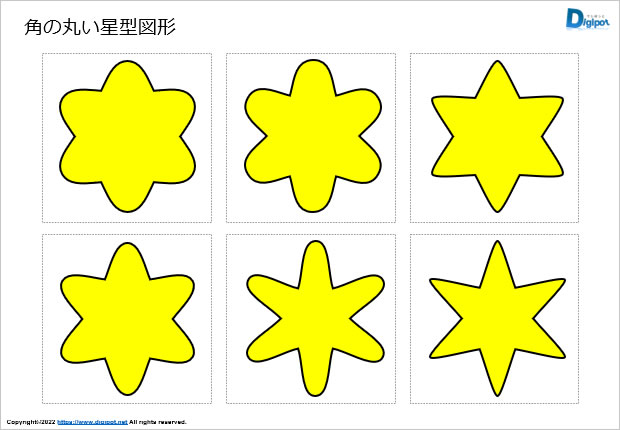 角の丸い星型図形、4/5/6/8つ角の星を各6パターンの24種類