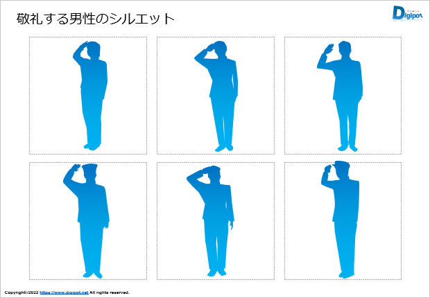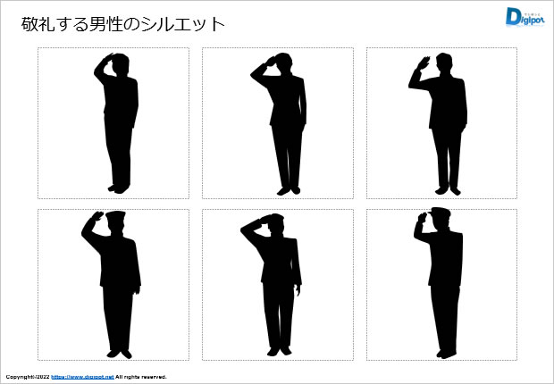 フリー、無料で使える敬礼する人物のシルエット画像です。パワーポイントPPTX形式、PNG透明ファイル形式、エクセルXLSX形式、ワードDOCX形式ファイルを用意しています。