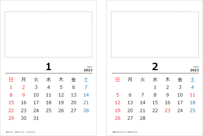 1ページに1か月の2023年用のカレンダーテンプレートです。予定を足したり画像を入れたりしてオリジナルカレンダー作成のテンプレートとしてご活用ください。