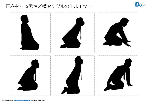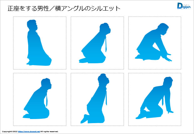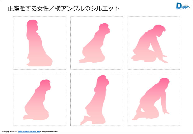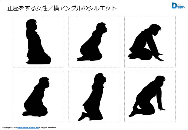 フリー、無料で使える正座をする人物/横アングルのシルエット画像です。パワーポイントPPTX形式、PNG透明ファイル形式、エクセルXLSX形式、ワードDOCX形式ファイルを用意しています。