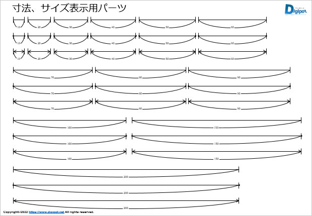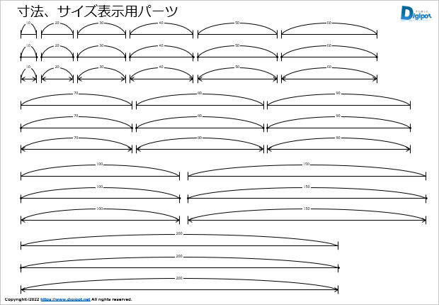 サイズをわかりやすくするための寸法、サイズ表示用パーツです。わかりやすい資料を作るためにご活用ください。