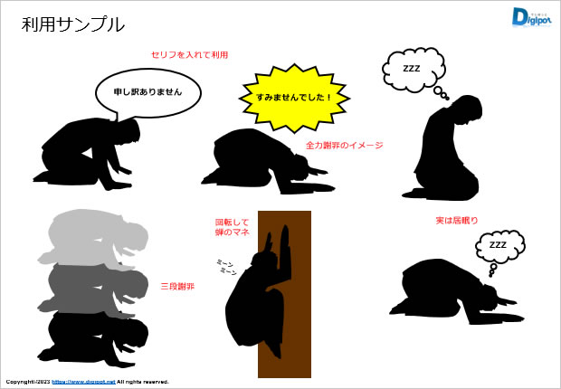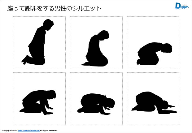 横からアングルの座って謝罪をする男性のシルエット、正座する男性、土下座謝罪するビジネスマン、深々と頭を下げる、頭を下げながらこっちを見る、手を付ける、手を付けない白黒、グラデーションなど12種類+利用サンプル(パワポ版のみ)