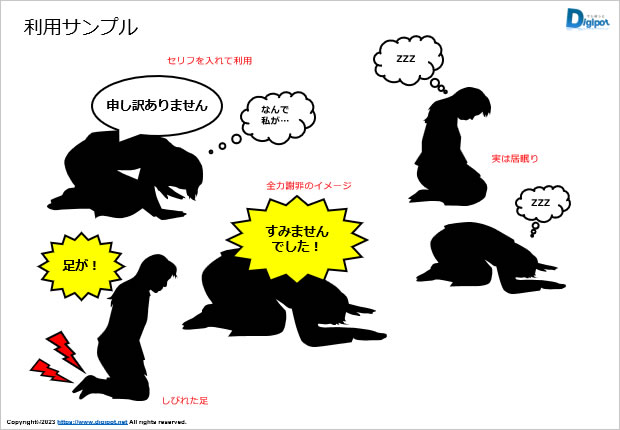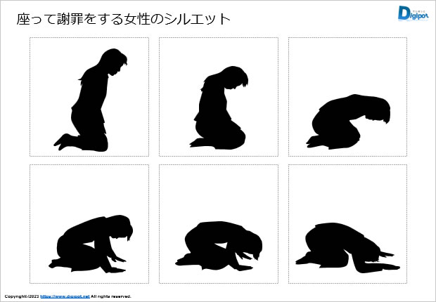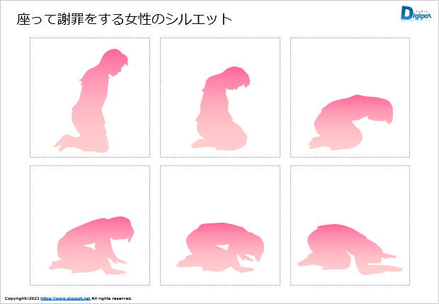 横からアングルの座って謝罪をする女性のシルエット、正座する女性、土下座謝罪するビジネスウーマン、深々と頭を下げる、頭を下げながらこっちを見る、手を付ける、手を付けない白黒、グラデーションなど12種類+利用サンプル(パワポ版のみ)