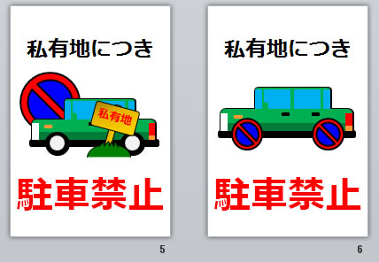 「私有地につき駐車禁止」の文字のみ、「私有地につき駐車禁止」とアイコン表示などA4縦/横