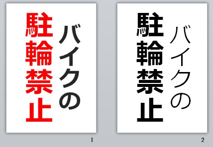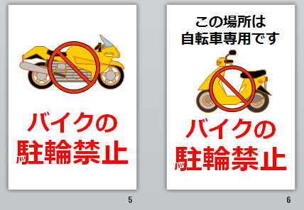 「バイクの駐輪禁止」の文字のみ、「バイクの駐輪禁止」とアイコン表示などA4縦/横