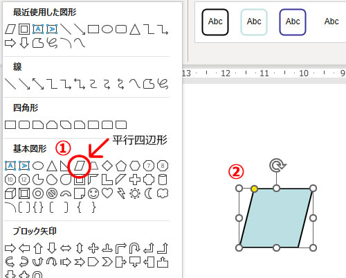 基本図形から(1)平行四辺形を選択し、(2)任意のサイズで描画します。