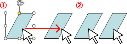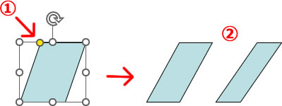 (1)黄色い丸の部分をクリックしながら左右に動かすと、(2)任意の角度のついた平行四辺形に変更することができます。