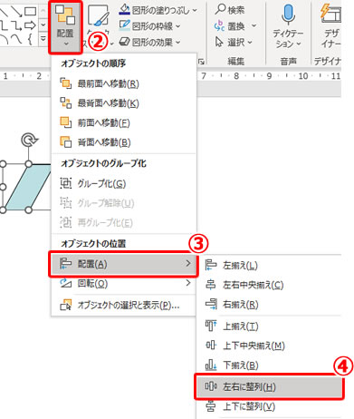 (1)3.でコピーしたオブジェクトをすべて選択し、メニューから(2)配置、(3)配置、(4)左右に整列を選択します。