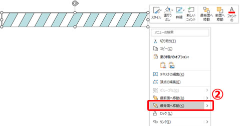 (1)4.で作成したオブジェクトに重ねるように四角を描画し、(2)メニューを表示させて最背面に移動を選択します。