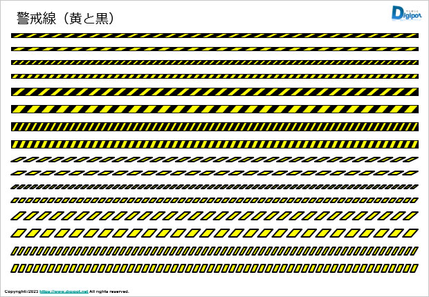 工事現場や事件現場、立入禁止場所でよく見る黄色と黒色の斜め縞々ライン素材です。警告、注意、危険などを示す貼り紙の素材などにご活用ください。