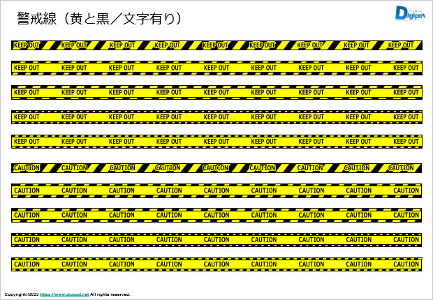 フリー、無料で使える警戒線、KEEEP OUTのライン画像です。パワーポイントPPTX形式、PNG透明ファイル形式、エクセルXLSX形式、ワードDOCX形式ファイルを用意しています。