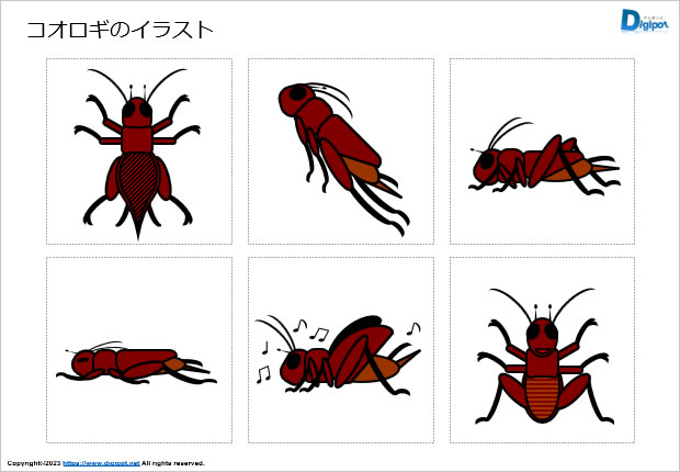 コオロギのイラスト、興梠、上から見たコオロギ、鳴いてるコオロギ、飛んでるコオロギなど6種類