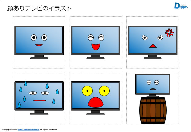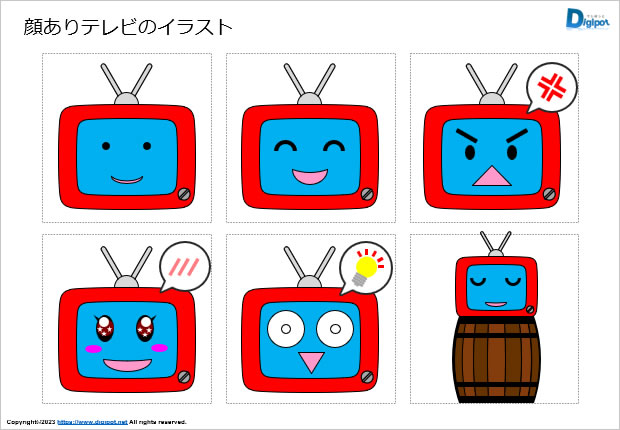 顔有りテレビのイラスト、表情のあるテレビ、笑い顔、驚いた顔、寝ているテレビ、樽に乗ったテレビなど12種類