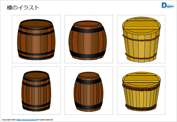 樽のイラスト、ビア樽、木樽、漬物樽、酒樽、角度違いなど12種類