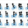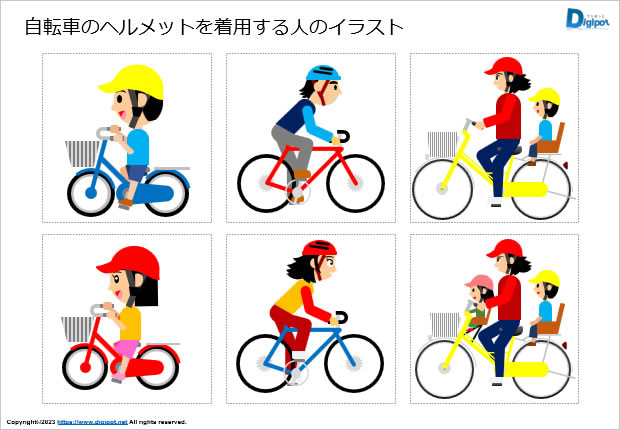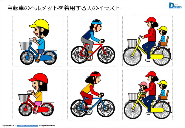 自転車のヘルメットを着用する人のイラスト、自転車に乗る人、子供と自転車でヘルメット着用、フチ有りフチ無しなど12種類