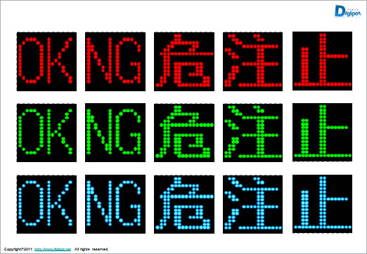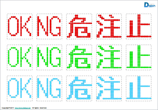 P、満、空、閉、開、OK、NG、危、注、止の赤緑青の背景黒と白など60種類