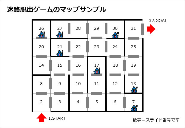 フリー、無料で使える迷路脱出ゲームです。パワーポイントPPTX形式で作成しています。パワーポイントのアニメーション機能を使用しております。